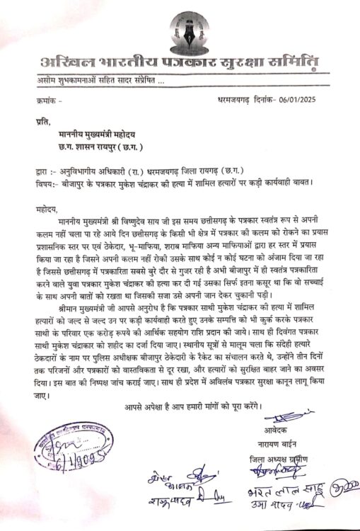 जिसकी सजा उसे अपनी जान देकर चुकानी पड़ी। आपसे अनुरोध है कि पत्रकार साथी मुकेश चंद्राकर की हत्या में शामिल हत्यारों को जल्द से जल्द उन पर कड़ी कार्यवाही करते हुए उनके सम्पत्ति को भी कुर्क करके पत्रकार साथी के परिवार को एक करोड़ रूपये की आर्थिक सहयोग राशि प्रदान की जाये। साथ ही दिवंगत पत्रकार साथी मुकेश चंद्राकार को शहीद का दर्जा दिया जाए। स्थानीय सूत्रों से मालूम चला कि संदेही हत्यारे ठेकदारों के नाम पर पुलिस अधीक्षक बीजापुर ठेकेदारी के रैकेट का संचालन करते थे, उन्होंने तीन दिनों तक परिजनों और पत्रकारों को वास्तविकता से दूर रखा, और हत्यारों को सुरक्षित बाहर जाने का अवसर दिया। इस बात की निष्पक्ष जांच कराई जाए। साथ ही प्रदेश में अविलंब पत्रकार सुरक्षा कानून लागू किया जाए। अखिल भारतीय पत्रकार सुरक्षा समिति के ग्रामीण जिलाध्यक्ष नारायण बाईन के नेतृत्व में ज्ञापन सौंपा गया, जिसमें भाजपा मंडल अध्यक्ष भरत लाल साहू, ऋषभ तिवारी, शेख आलम, राजू यादव, कुमारी उमा यादव शामिल रहे।