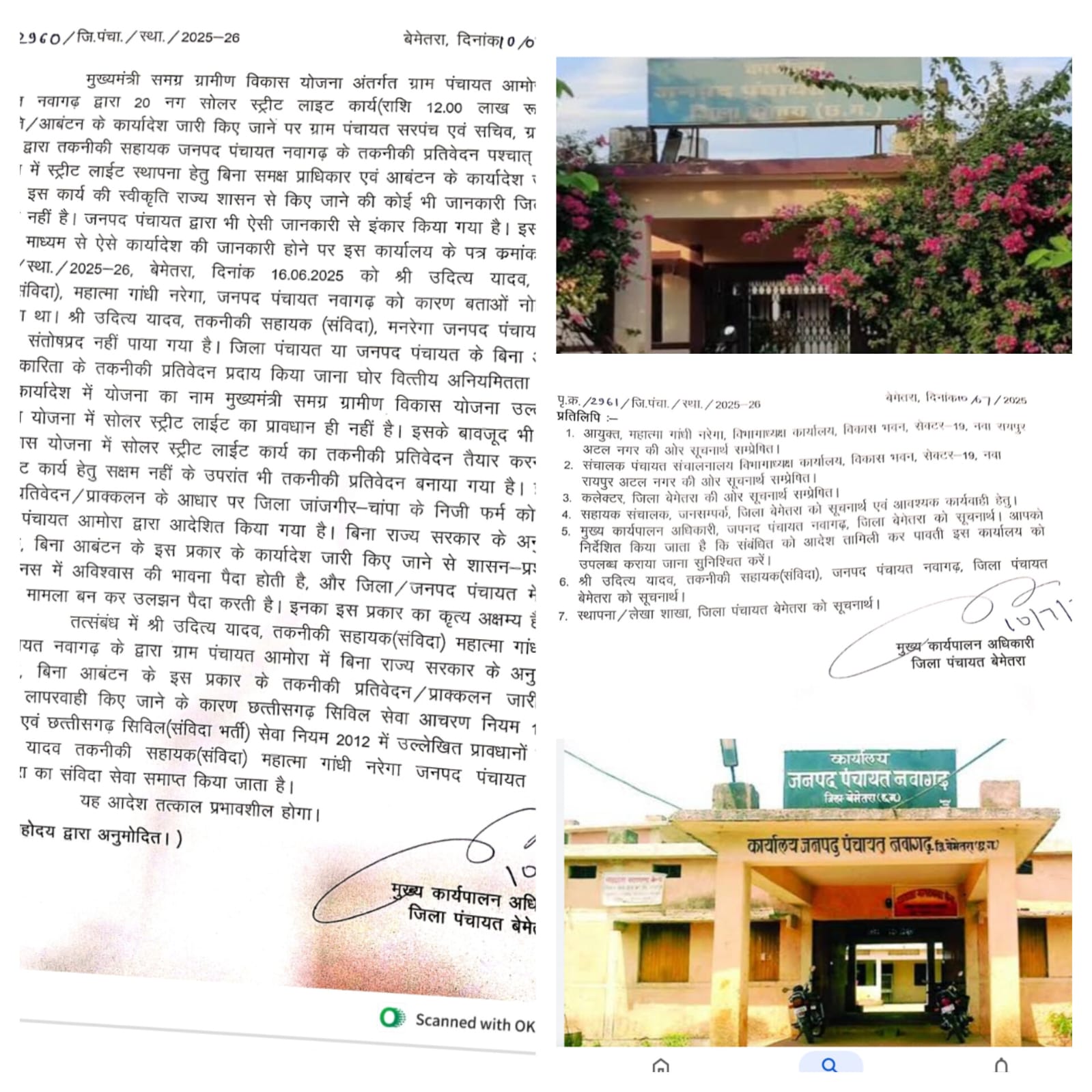 बेमेतरा जिले के नवागढ़ विधानसभा के ग्राम पंचायत में मुख्यमंत्री समग्र ग्रामीण विकास योजना के अंतर्गत ग्राम पंचायत अमोरा ने बीस नग सोलर लाइट लागत बारह लाख से लगाने बिना स्वीकृति जांजगीर चांपा के निजी फर्म को कार्य आदेश किए जाने के आरोप में कलेक्टर के अनुमोदन के बाद सीईओ जिला पंचायत ने मनरेगा शाखा नवागढ़ में पदस्थ तकनीकी सहायक उदित्य यादव को सेवा से बर्खास्त कर दिया है। जांच में यह बात सामने आई कि मुख्यमंत्री समग्र विकास योजना के नाम पर किसी भी सक्षम अधिकारी से बिना सलाह लिए अपने अधिकार क्षेत्र से परे जाकर बिना वित्तीय स्वीकृति तकनीकी सहायक ने सोलर लाइट का प्रतिवेदन तैयार कर दिया। तकनीकी सहायक के इस कृत्य से विभाग के सामने भुगतान संकट के साथ छबि पर विपरित असर पडऩे की प्रबल संभावना थी। राज्य सरकार द्वारा ऐसा कोई आदेश नहीं है जिससे इस योजना से सोलर लाइट लगाया जा सके।