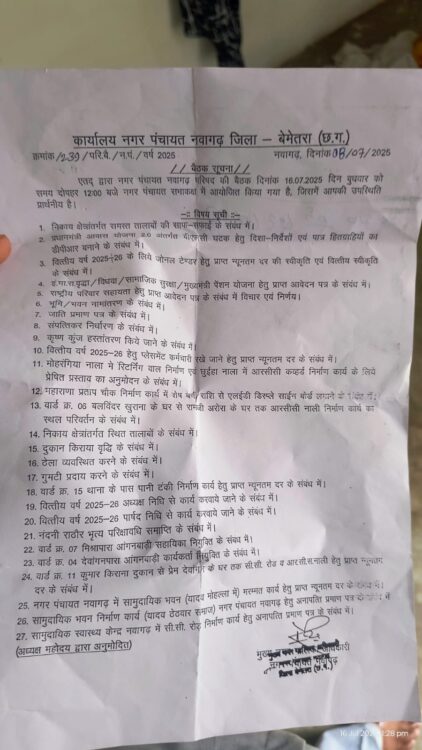 नगर पंचायत नवागढ़ में बुधवार को प्रस्तावित महत्वपूर्ण बैठक एक बार फिर बिना ठोस कारण के स्थगित कर दी गई। इससे जनहित से जुड़े कई जरूरी कार्यों पर असर पड़ा है। इस बैठक में 27 मुद्दों पर चर्चा होनी थी, जिनमें बच्चों के जाति प्रमाण पत्र निर्माण, वृद्धा पेंशन, निर्माण कार्य और नागरिक सुविधाओं जैसे विषय प्रमुख थे। नगर पंचायत अध्यक्ष सिद्धांत चौहान ने बैठक के स्थगन पर नाराजगी जताते हुए कहा कि यह बैठक पार्षदों की मांग पर बुलाई गई थी और सभी ने प्रस्तावों को पारित करने की सहमति दी थी। लेकिन ऐन वक्त पर सीएमओ द्वारा बिना कारण बैठक टाल दी गई, जिससे यह स्पष्ट है कि किसी के दबाव में राजनीतिक खेल खेला जा रहा है। अध्यक्ष ने यह भी बताया कि नवागढ़ क्षेत्र का मिशल बंदोबस्त पूरी तरह से गड़बड़ा चुका है, जिससे बच्चों के जाति प्रमाण पत्र बनाना मुश्किल हो गया है। नगर पंचायत की ओर से प्रस्तावित समाधान भी बैठक स्थगन की वजह से अटक गया। इसके साथ ही, 8 महीने से लंबित वृद्धा पेंशन योजना पर भी इस बैठक में निर्णय लिया जाना था, ताकि बुजुर्गों को राहत मिल सके। अब यह मुद्दा भी अधर में लटक गया है। नगर के नागरिकों में भी बैठक स्थगन को लेकर असंतोष है। लगातार स्थगित होती बैठकों से विकास कार्य बाधित हो रहे हैं और आम जनता को नुकसान उठाना पड़ रहा है।
