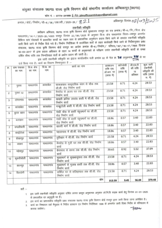 कांसाबेल और पत्थलगांव क्षेत्र के जिन ग्रामों में सीसी रोड निर्माण स्वीकृत हुआ है, उनमें शामिल हैं – ग्राम पुसरा में सारूकछार सामुदायिक भवन से चौक तक ग्राम पुसरा 2 में मेनरोड से अजय घर तक ग्राम टांगरगांव में खखरी झरिया उपरांव बस्ती कांसाबेल में गन्झुटोली बस्तीग्राम बटूराबहार में गांधी चौक से बस्ती पहुंच मार्गग्राम बालाझार में गांधी चौक से बस्ती पहुंच मार्गग्राम पंडरीपानी में खजरी मार्गग्राम सरईटोला में पहला पारा शेखरपुर में तुरीखार कछार में मेन रोड से गुडी घर तक महेशपुर में बैगापारा से सरना तक कुकरी चोली में मुख्यमार्ग से सुखबासु पारा तक बंधनपुर में मुख्यमार्ग से गुलाब बस्ती तक ग्राम बिलड़ेगी में सर्किल घर से सलिहा पारा तक यह सभी निर्माण कार्य छत्तीसगढ़ राज्य कृषि विपणन बोर्ड से स्वीकृत किए गए हैं।