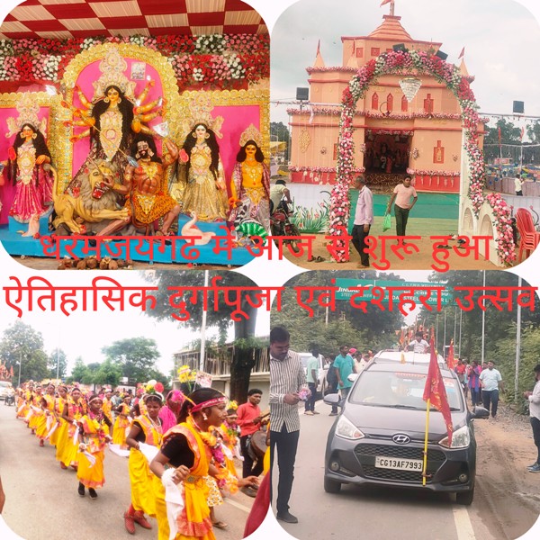 दुर्गापूजा समिति पहली बार एक अलग ही तरीके से मां दुर्गा की मूर्ति का स्वागत किया है, अनिल ढाबा के पास जैसे ही मां दुर्गा की मूर्ति पहुंंचा वैसे बाजे गाजे के साथ कार रैली और महिला कर्मा पार्टी द्वारा जोरदार स्वागत किया और रैली निकाल कर दुर्गा पंडाल तक लाया गया है। ऐसा स्वागत पहली बार धरमजयगढ़ में किया गया है। दो दिन तक गरबा का कार्यक्रम किया गया और आज क्लब ग्राउंड में गु्रप डांस का आयोजन किया जायेगा। समिति द्वारा क्षेत्रवासियों से अपील किया है कि दुर्गापूजा एवं कार्यक्रम को सफल बनाने के लिए अधिक से अधिक लोग पहुंचे और कार्यक्रम का लुप्त आनंद उठाए।