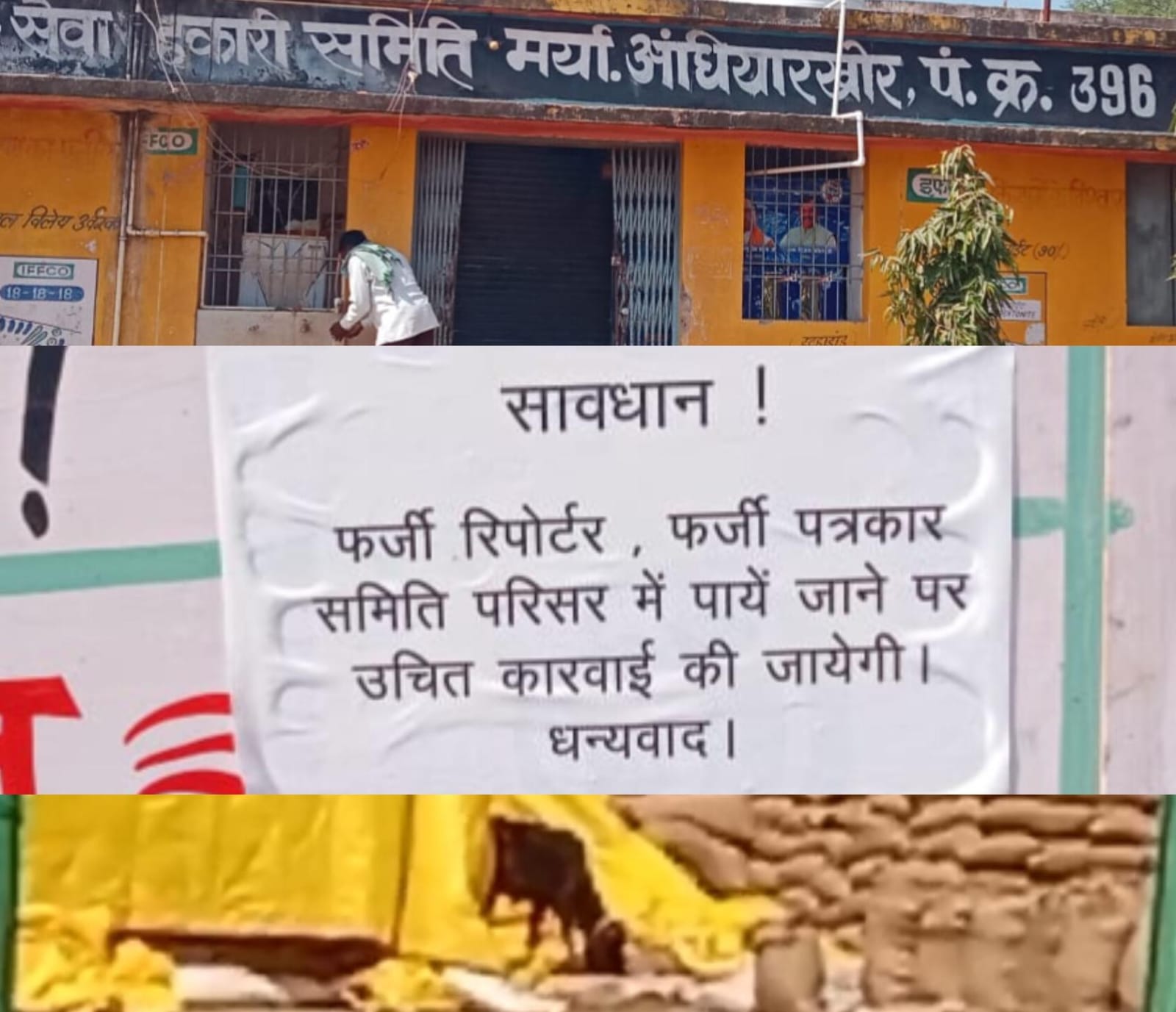 बेमेतरा जिला में अजब गजब का चल रहा खेल, एक बार फिर आया सेवा सहकारी समिति का मामला जहां सरकार और जिला प्रशासन का निर्देश का खुला उल्लंघन देखने को मिला आपको बता दे कि सेवा सहकारी समिति मर्यादित अधियारखोर में धान खरीदी फड़ के अंदर समिति के कर्मचारी के उपस्थिति होने के बाद भी देख रेख व जिम्मेदारी में असुविधा और दिनदहाड़े मवेशी फड़ के अंदर तिरपाल के ऊपर खड़ा होकर धान को खा रहा तो तिरपाल का हालात क्या होगा। लेकिन यह सब पर समिति के जिम्मेदार का ध्यान नहीं और भूषि स्टेकिंग लेयर और सत्यापन किये गए समिति के समान का जांच किया जाये तो कई तथ्य निकल कर सामने आ जायेगा। लेकिन यह तो अधिकारियों का जांच का विषय है, जिले के सेवा सहकारी समिति में आने जाने का समय सुनिश्चत क्यों नहीं मनमर्जी कब तक चलेगा कर्मचारियों का राज और वही प्रभारी समिति प्रबंधक भोला राम साहू द्वारा फर्जी रिपोर्टर और फर्जी पत्रकार का समिति में आने से प्रबंधित का निर्देश जारी कर बोर्ड लगाया गया। यह बहुत ही बेमेतरा जिले में अच्छी पहल जिले के पत्रकारों कों फर्जी रिपोर्टर का पहचान कराने के लिए चलाया गया। लेकिन यह सवाल खड़ा भी हो गया जो बेमेतरा जिला में कौन फर्जी पत्रकार है जिनके लिए आदेश निकालकर सेवा सहकारी के धान खरीदी पर फर्जी रिपोर्टर का बोर्ड लगाया गया उनका पहचान जिला के पत्रकारों के सामने कराया जाए प्रभारी प्रबंधक क्योंकि जिले के पत्रकार भी फर्जी को पहचान सके और सेवा सहकारी समिति के धान खरीदी का जिम्मेदार विभाग के अधिकारियों से जांच करा सकंे।