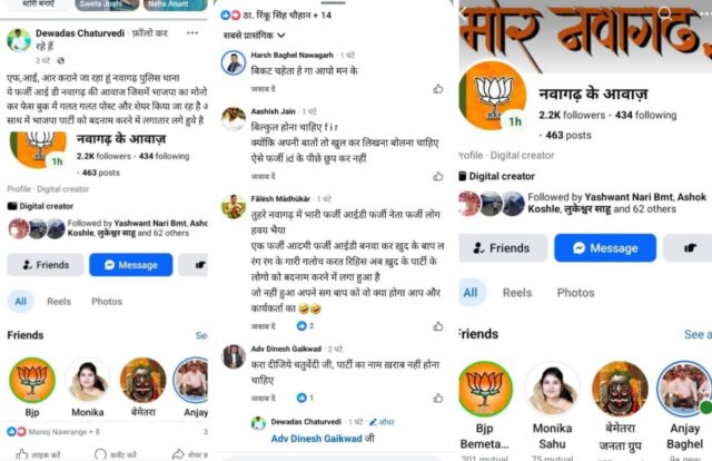 फिलहाल यह साफ नहीं है कि यह काम किसी व्यक्ति विशेष, राजनीतिक दल, या संगठित समूह का है। लेकिन इतना तय है कि मामला अब तूल पकड़ चुका है और आने वाले दिनों में कई चौंकाने वाले खुलासे हो सकते हैं। बहरहाल मामला जल्द ही नवागढ़ थाना पहुंचने की बात सामने आ रही है। फेसबुक सोशल मीडिया पर भाजपा के वरिष्ट नेता ने पोस्ट किया, मैं एफ.आई.आर कराने जा रहा हूं नवागढ़ पुलिस थाना ये फर्जी आई डी नवागढ़ की आवाज जिसमें भाजपा का मोनों लगा कर फेसबुक में गलत गलत पोस्ट और शेयर किया जा रहा है और साथ में भाजपा पार्टी को बदनाम कर रहा, अब देखना होगा की सच्चाई क्या सामने आएगा है।